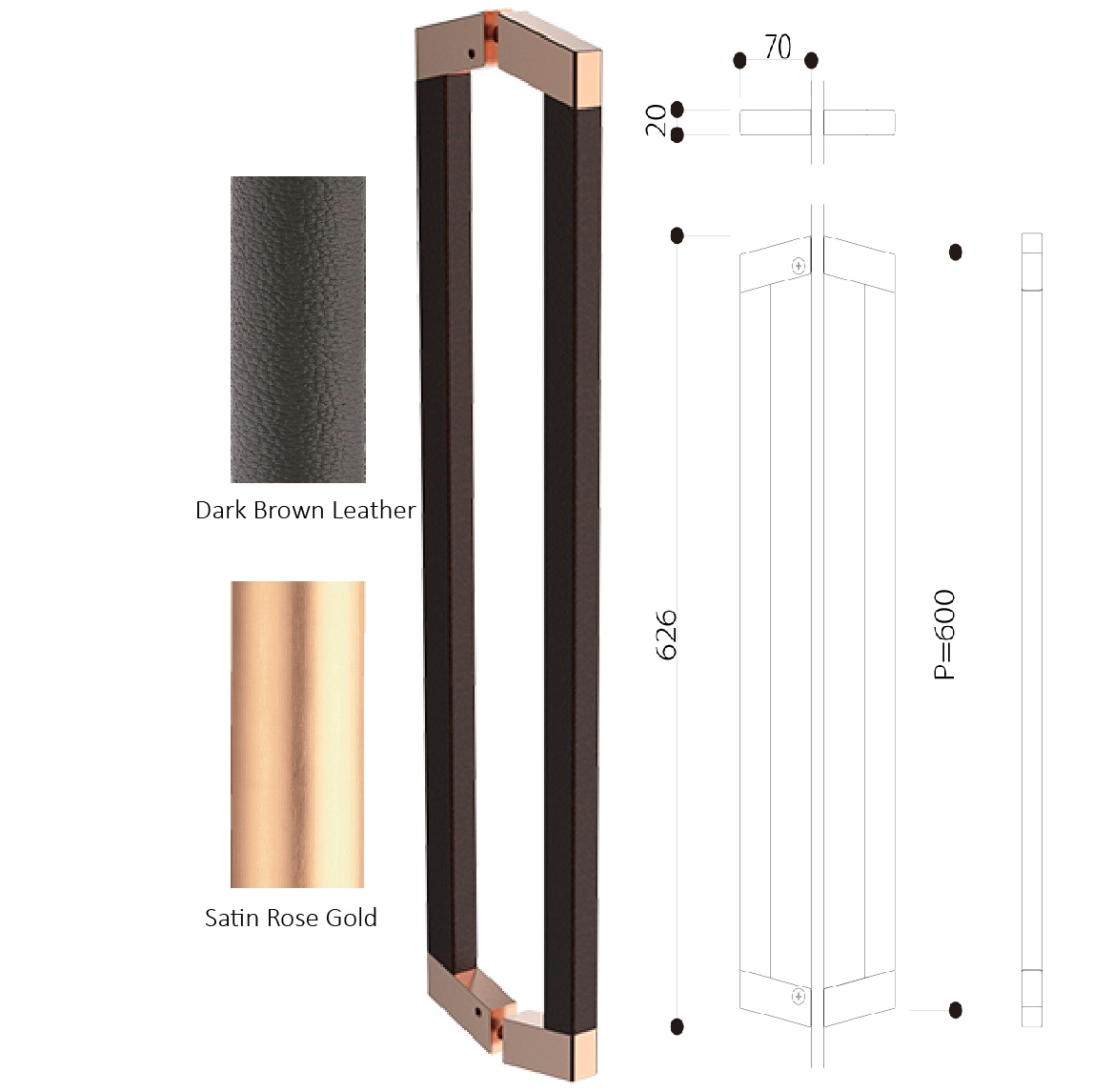 Available Finishes: Satin Rose Gold & Dark Brown Leather