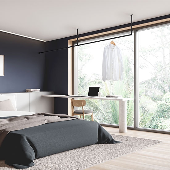負載能力:147N(15kgf) 天花板安裝用 可用於洗衣間、客廳等各種空間的室內晾衣掛桿。 也可懸掛觀葉植物或間接照明,作為室內裝飾使用。 提供霧面黑與白兩種顏色。 導軌部分可裁切調整長度。 HANGER BAR COLLECTION(吊掛桿系列)