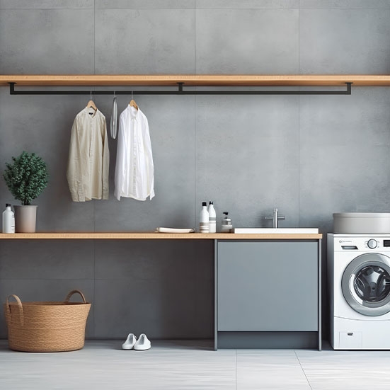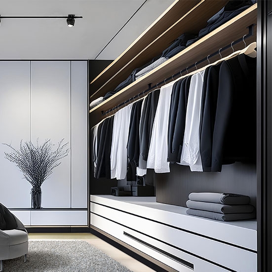 負載能力:147N(15kgf) 附於層板用 適用於衣櫃等空間的吊掛桿。 不同於一般不鏽鋼材質,採用霧面白色或黑色設計, 能大幅改變衣櫃內的氛圍。 導軌部分可裁切調整長度。 HANGER BAR COLLECTION(吊掛桿系列)