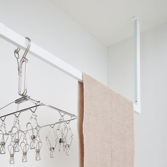 負載能力:98N(10kgf) 天花板安裝用 可用於洗衣間、客廳等各種空間的室內晾衣掛桿。 也可懸掛觀葉植物或間接照明,作為室內裝飾使用。 提供霧面黑與白兩種顏色。 導軌部分可裁切調整長度。 HANGER BAR COLLECTION(吊掛桿系列)